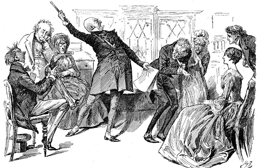 Dickens surely wanted us to laugh — to laugh at his foolish villains, but also to laugh with those madcap souls that he could create by the dozens. And sometimes you get them both at once! “You — you — you HEEP of infamy!” cries Mr. Micawber, brandishing his ruler like a broadsword, while keeping the ’umble Uriah’s fingers from getting hold of the document that is going to send him to jail. Anybody can come up with a blackmailer and a forger, though not one as memorably vile as Uriah Heep, but it takes all the great-hearted laughter of Charles Dickens to fashion a Mr. Micawber, bald, magniloquent, irresponsible, tender-hearted, and foolish, but with a human heart and a human conscience that won’t be suppressed forever.