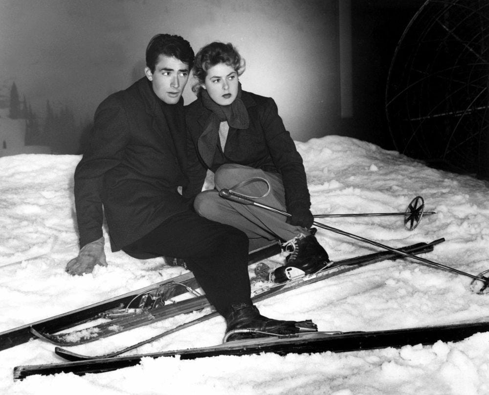 We tell stories about ourselves, too, and when there’s something we’d rather not face, if it’s something extreme, we try hard to forget it or to bury it. That’s one of the insights — he did have some, after all, despite the many things he got wrong — that Freud made known to the world, and whatever else we may think of it, it forms the foundation of Hitchcock’s film. A young man suffering amnesia (at our house, we jestingly call it “magnesia,” and wonder why they don’t have an over-the-counter remedy for it) shows up at a psychiatric hospital in Vermont to take charge of it. This young man (Gregory Peck) calls himself Dr. Edwardes, and he does know a lot about psychology, but we see pretty quickly that there’s something wrong with him, and in fact he’s an impostor. The real Edwardes is dead. Meanwhile, the woman doctor at the hospital, Dr. Petersen (Ingrid Bergman, nominated for an Oscar for her role), falling in love with the young man, suspects that there is something buried in his mind that needs to be unearthed. The film recounts that quest to find out, from wherever it is in his mind, what this man, whose real name is John Ballantine, has done or has seen. It is both a psychological probe and a mystery. Why does this man who does not know who he is feel guilty? What is the source of that feeling? Who actually is guilty of the death of Edwardes, if anyone?